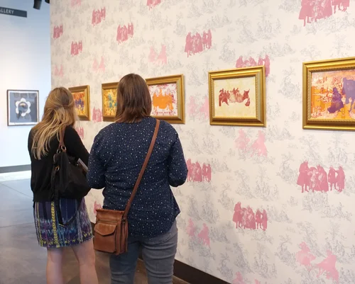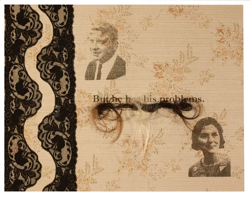 Images silkscreened over vintage wallpaper collaged with lace and hair.